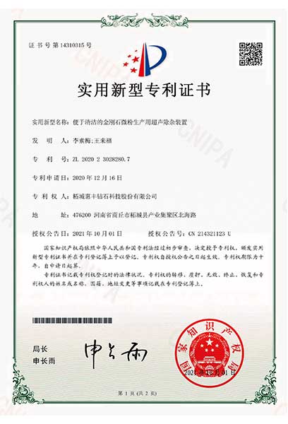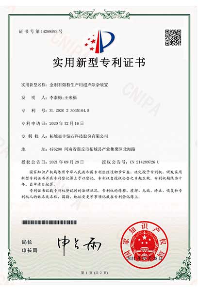 金剛石微粉生產(chǎn)用超聲除雜裝置 ZL 2020 2 3035184.5 2021-09-28